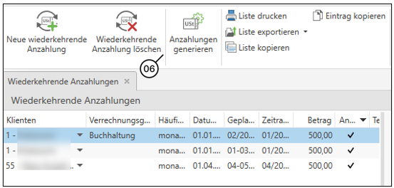 Nachdem die Daten der wiederkehrenden Anzahlung eingegeben und gespeichert wurden, können über die Schaltfläche Anzahlungen generieren (6) die dazugehörigen Anzahlungszeilen generiert werden.