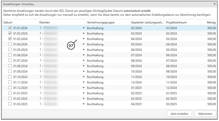 Es werden die Anzahlungszeilen bis zum aktuellen Tagesdatum angehakt. Fortlaufend werden, nur bei aktivem RZL Dienst, die Zeilen automatisch je Monat/Quartal etc. erzeugt. Es werden für alle zugeordneten Klienten die Anzahlungszeilen erzeugt. Für welche Klienten, ist in der Anzahlungsvorschau über den Pfeil (7) ersichtlich.