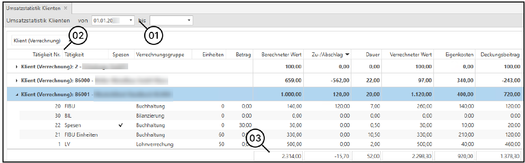 Die Statistik kann auf einen bestimmten Zeitraum (1) eingeschränkt werden und ist nach Klienten gruppiert (2). Der eingeschränkte Zeitraum von/bis Datum ist das verrechnete Notendatum. Über den Pfeil beim jeweiligen Klienten können die Details der Tätigkeiten aufgerufen werden. Die Gesamtsumme pro Klienten ist in der fett dargestellten Überschriftenzeile dargestellt. Es sind die Spalten Tätigkeit Nr., Tätigkeit, Spesen, Verrechnungsgruppe, Einheiten, Betrag, Dauer, Berechneter Wert, Zu-/Abschlag, Verrechneter Wert, Eigenkosten und Deckungsbeitrag vorhanden.