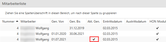 Wenn es bei einem Mitarbeiter mehrere Generationen im Reiter HON gibt, erscheint der Mitarbeiter pro Generation in der Liste. Über die Spalte Aktuelle Generation sieht man, welche Generation aktuell in Verwendung ist.