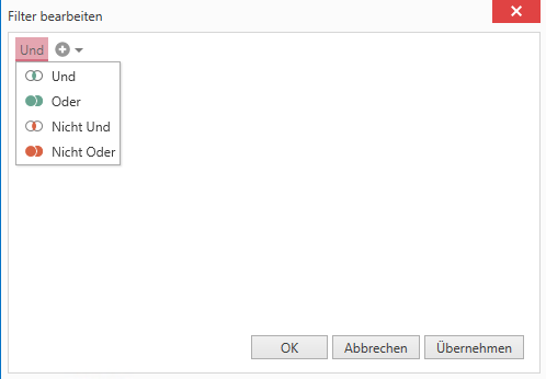 Im Expertenmodus können beliebig viele Und, Oder, Nicht Und und Nicht Oder Bedingungen erstellt werden. Durch einen Klick auf das Dropdownfeld können die Bedingungen ausgewählt werden. Mit einem Klick auf das Plus-Symbol können mehrere Verknüpfungen für den zu erstellenden Filter ausgewählt werden.
