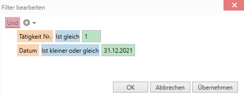 Über das Plus-Symbol können dem Filter noch weitere Bedingungen hinzugefügt werden. Im unten angeführten Beispiel filtert der angelegte Expertenfilter alle Zeilen der Tätigkeit eins bis zum 31.12.2021