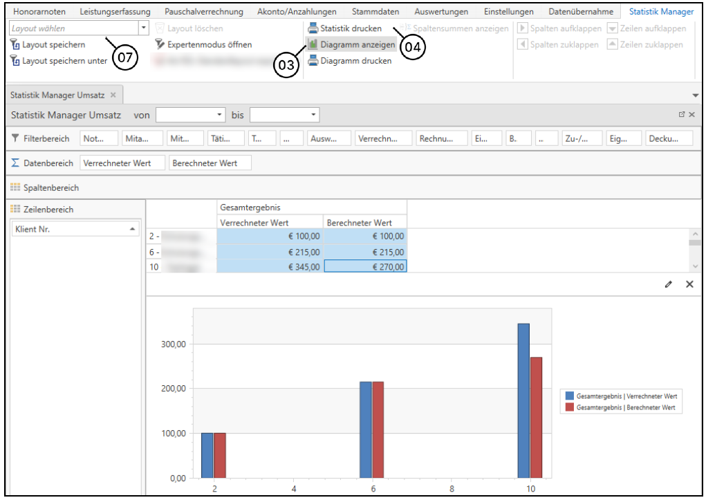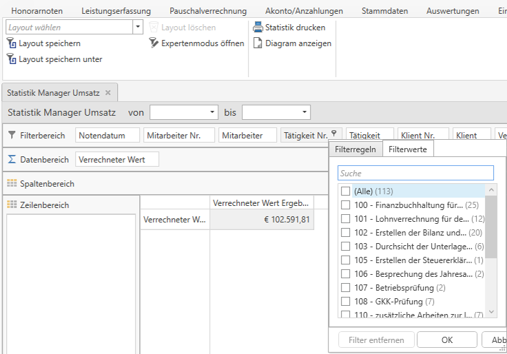 Der Statistik Manager ist eine Umsatzstatistik und bezieht sich auf abgerechnete Leistungen. Alle Leistungen (offen und verrechnet) können Sie über den Statistik Manager Leistungen auswerten.