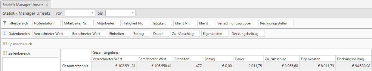 Im Datenbereich definieren Sie, welche Ergebnisse Sie auswerten möchten. Es sind folgende Felder im Datenbereich möglich: Verrechneter Wert, Berechneter Wert, Einheiten, Betrag, Dauer, Zu-/Abschlag, Eigenkosten und Deckungsbeitrag.