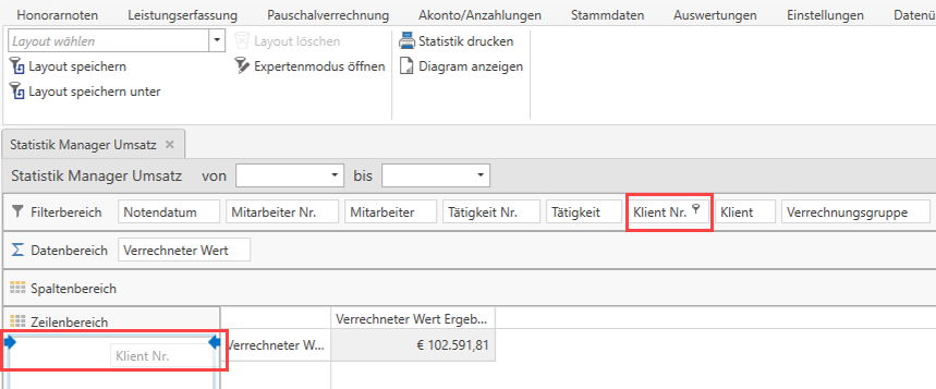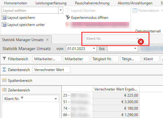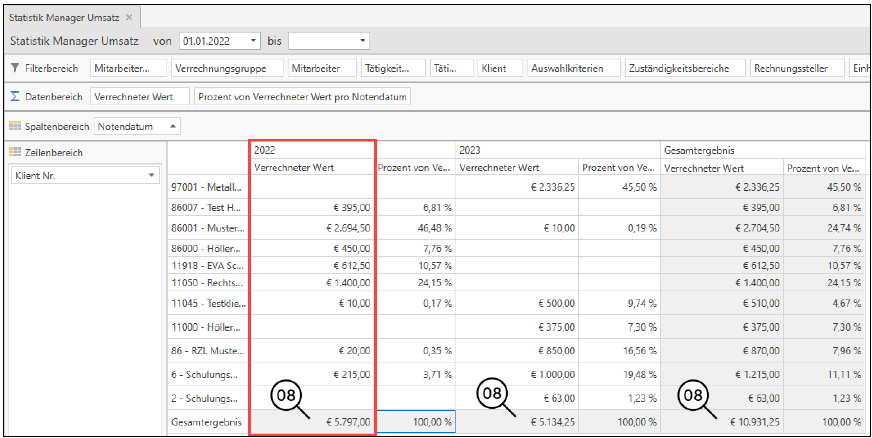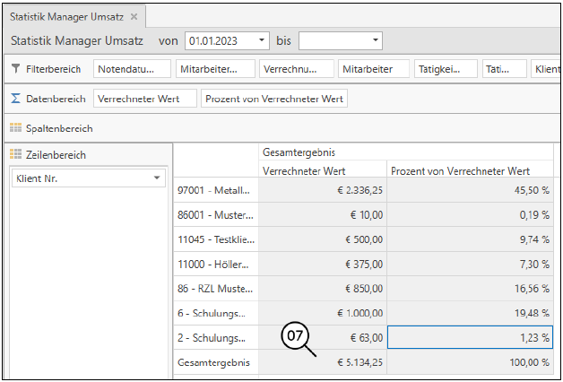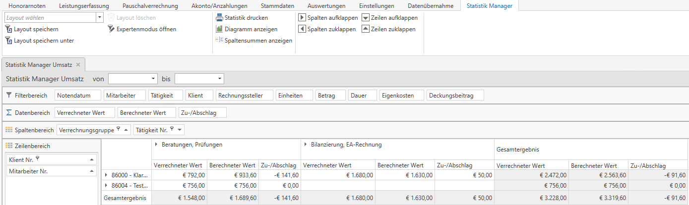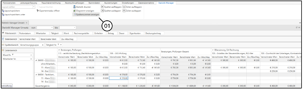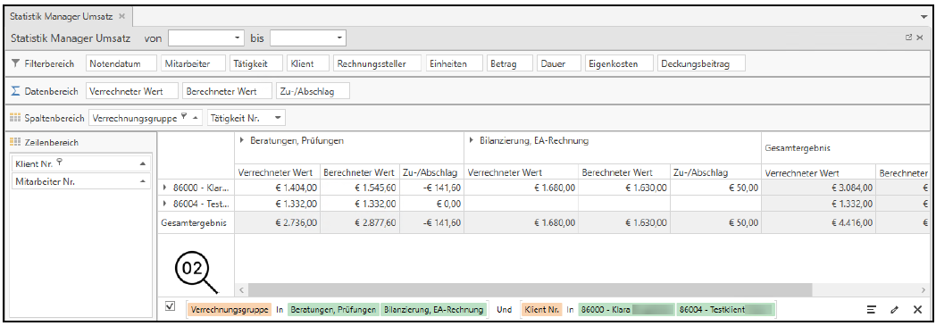 Beispiel: Umsatz je Klient und Mitarbeiter aufgeteilt pro Verrechnungsgruppe und Tätigkeit