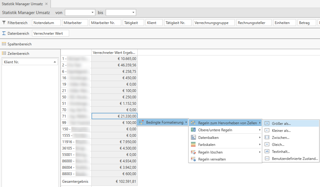 Haben Sie eine Statistik mit vielen Datensätzen erzeugt, können Sie mit der rechten Maustaste in ein Feld über die Bedingte Formatierung Felder die Bsp. über den Durchschnitt liegen oder einen bestimmten Wert üb-/unterschreiten farbliche markieren.