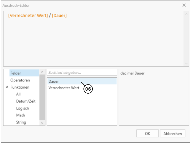 Mit einem Doppelklick auf die Felder (6) wählen Sie diese aus und können damit die Formel generieren. Zum Rechnen stehen Ihnen die Standarteingaben (/, *, +, -) zur Verfügung.