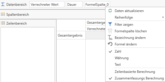 Im Datenbereich ist nun die Formel Spalte ersichtlich. Mit Rechtsklick auf die Formelspalte können Sie die Bezeichnung ändern, die Spalte wieder Löschen oder die Formel erneut aufrufen.