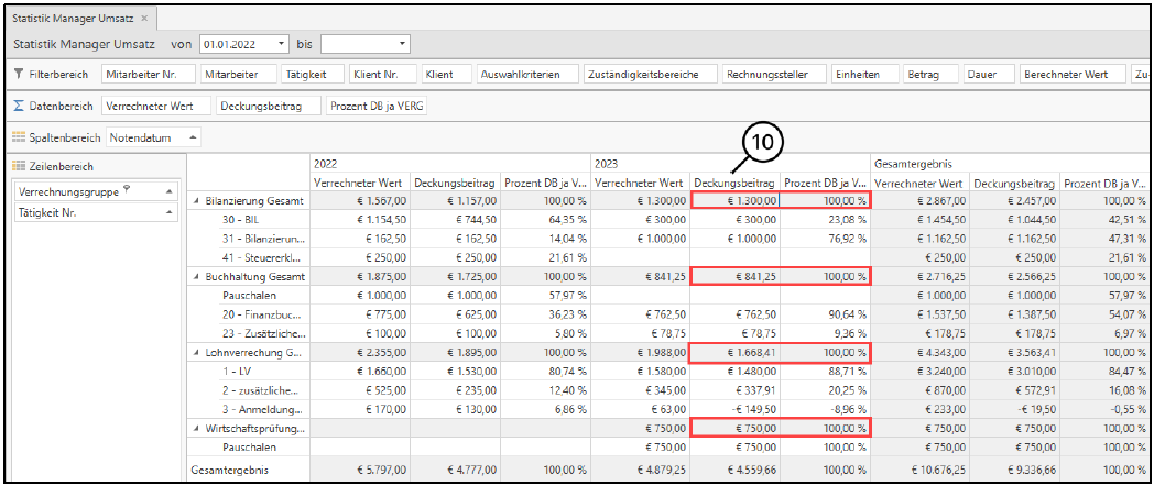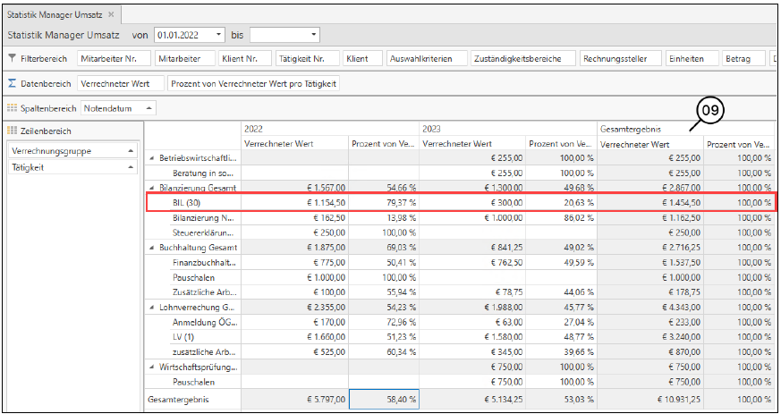 Im Statistik Manager Leistungen werden alle Zeilen, offene sowie verrechnete berücksichtigt.