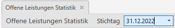 Nach dem Öffnen der Offenen Leistungen Statistik ist zuerst der Stichtag zu definieren Bsp. offene Leistungen zum 31.12.. Initial wird hier das Tagesdatum vorgeschlagen.