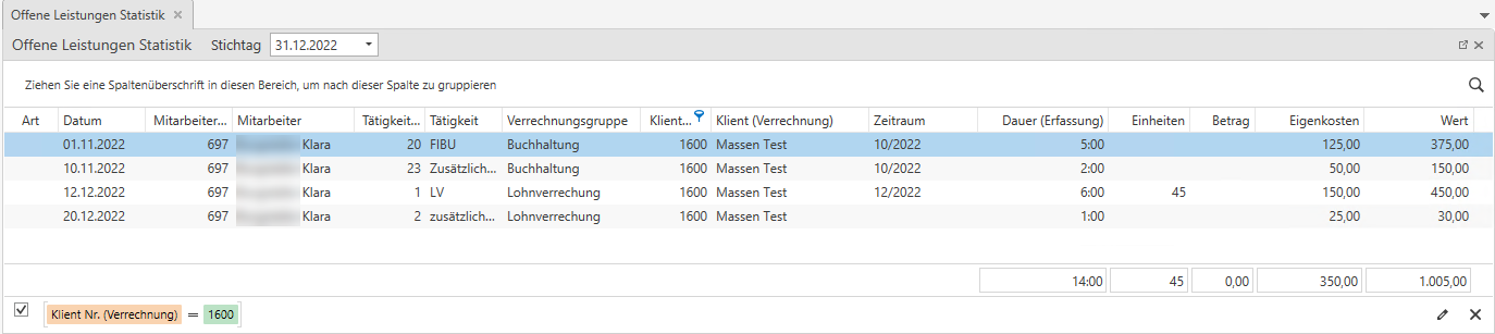 Man möchte die offenen Leistungen des Klienten Nr. 1600 zum Stichtag 31.12.2022 herausfiltern. Dazu öffnet man die Offene Leistungen Statistik, definiert den Stichtag und Filtert auf diesen Klienten.