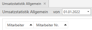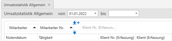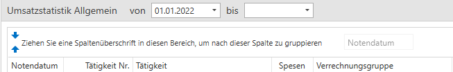 Es werden Ihnen Anfangs alle abgerechneten Zeilen angezeigt. Die Statistik kann auf einen bestimmten Zeitraum eingeschränkt werden und ist nicht gruppiert. Der eingeschränkte Zeitraum von/bis Datum ist das verrechnete Notendatum.
