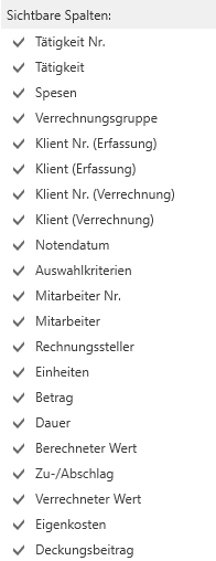 Wenn Sie nach den Spalten Mitarbeiter Nr./Name, Tätigkeit Nr./Name, Klient Nr./Name gruppieren, wird automatisch die Korrespondenzspalte auf der gleichen Ebene eingefügt. Mit Rechter Maustaste auf eines der beiden Felder, können Sie die Gruppierung entfernen.