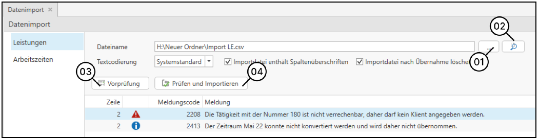 Datenimport Leistungen und Arbeitszeiten