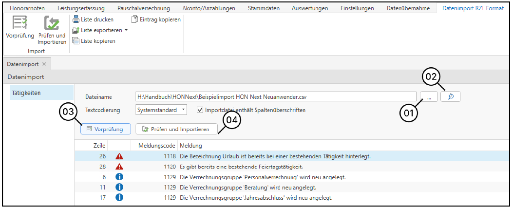 Vorab wird empfohlen, eine Vorprüfung (3) durchzuführen, somit werden Sie gleich auf etwaige Probleme hingewiesen. Nach der erfolgreichen Vorprüfung können Sie mit der Schaltfläche Prüfen und Importieren (4) die Tätigkeiten in die Honorarverrechnung holen.