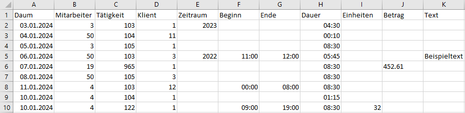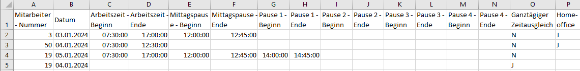 | 3 | Arbeitszeit - Beginn | Nein | In der Form SS:MM (Stunden:Minuten) |