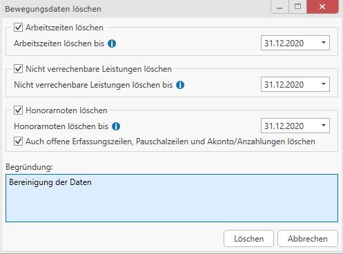 Der Menüpunkt Bewegungsdaten löschen löscht die jeweiligen ausgewählten Bewegungsdaten bis zu einem bestimmten Stichtag. Beim Löschen der Bewegungsdaten ist die Angabe einer Begründung verpflichtend.