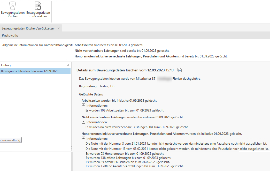 Nach dem Bewegungsdaten löschen/Bewegungsdaten zurücksetzen erhalten Sie ein Protokoll. In diesem Protokoll ist ersichtlich, welche Daten bis zu welchem Stichtag gelöscht wurden. Weiters erhalten Sie hier auch Informationen darüber, falls ein Löschen bestimmter Daten nicht möglich war. Bsp. Solange es verrechnete aber nicht ausgeglichene Pauschalzeilen gibt, kann diese Note nicht gelöscht werden.