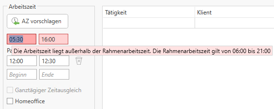 Beispiel: Im HON Next ist eine Rahmenarbeitszeit von 06:00 - 21:00 Uhr definiert. Der Mitarbeiter möchte in seiner Leistungserfassung als Beginn der Arbeitszeit 05:30 eingeben – es kommt folgender Hinweis in der Leistungserfassung des Mitarbeiters: