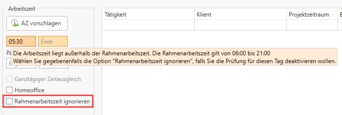 Mit der Option Rahmenarbeitszeit ignorieren kann die Rahmenarbeitszeit bewusst für diesen einen Tag deaktiviert werden. Es gibt weder im HON Next noch im LE Next einen Hinweis.