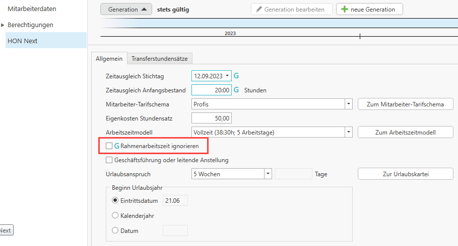 Sollte für bestimmte Mitarbeiter die Rahmenarbeitszeit nicht gelten, können Sie in den Stammdaten der Mitarbeiter im Reiter HON Next die Option Rahmenarbeitszeit ignorieren aktivieren. Für diese Mitarbeiter wird die Prüfung der Rahmenarbeitszeit nicht angewendet.