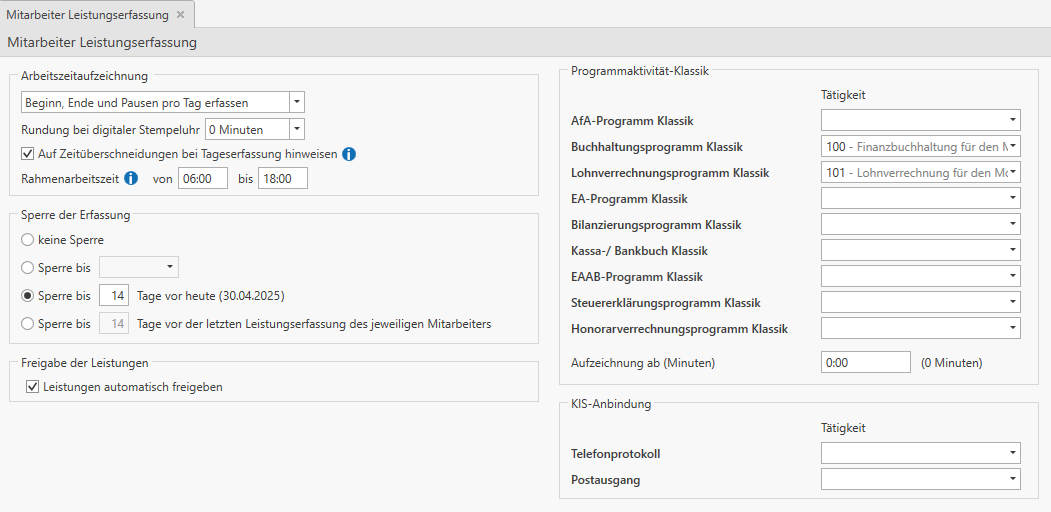Wählen Sie den Button Mitarbeiter Leistungserfassung aus, um die Grundeinstellungen für das Sperren der Leistungserfassung festzulegen oder die Leistungen automatisch freigeben zu lassen.
