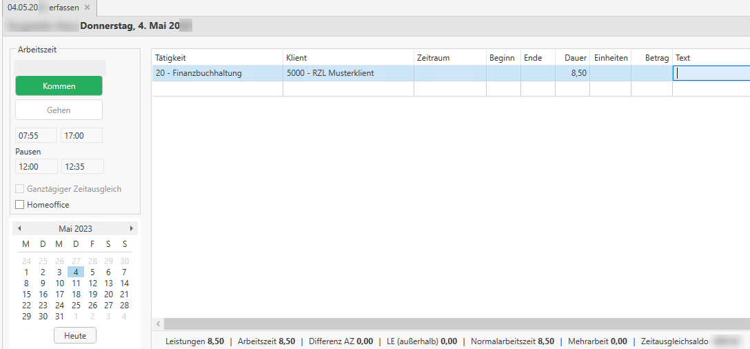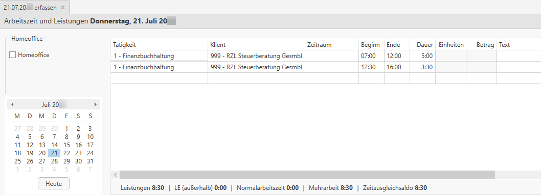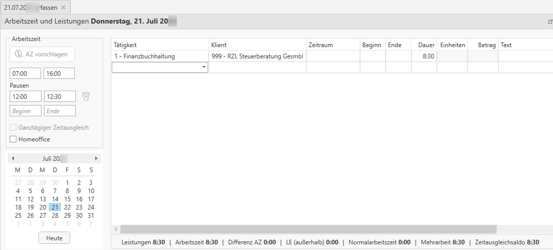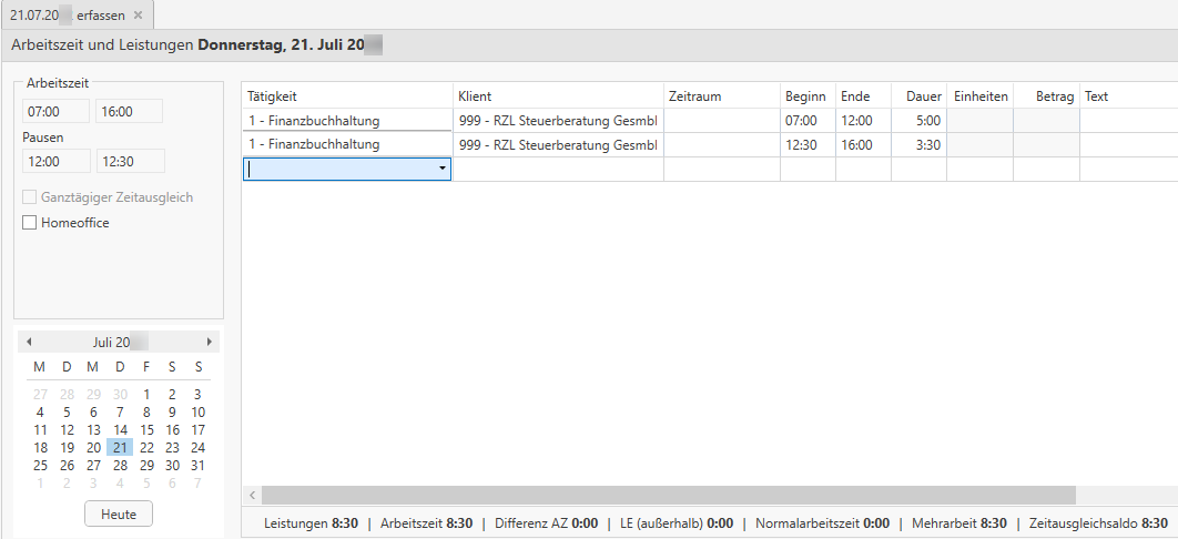 Bei dieser Variante gibt der Mitarbeiter keine Arbeitszeit ein, sondern aufgrund der eingegebenen Leistungszeilen mit Beginn und Ende wird die Arbeitszeit und die Unterbrechungen ermittelt. Wenn beispielsweise ein ganzer Tag an einer FIBU gearbeitet wurde, müssen – damit die Mittagspause errechnet werden kann – zwei Tätigkeiten erfasst werden, wobei in den Feldern Beginn und Ende der Vormittag z. B.: 07:00 – 12:00 Uhr und der Nachmittag z. B.: 12:30–16:00 erfasst werden.