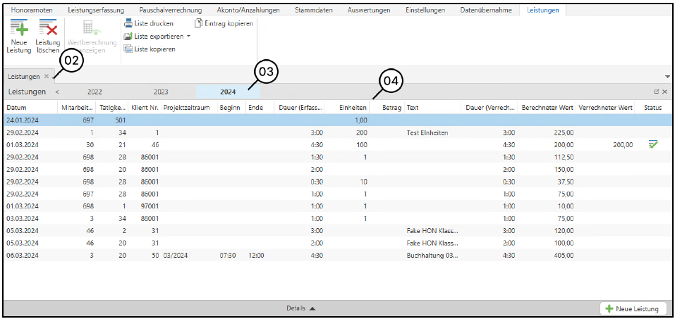 Die Leistungsübersicht enthält nachfolgende Spalten (4):