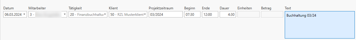 Es öffnet sich im unteren Bereich eine Eingabemaske in der Sie die Leistung eintragen können. Mittels der Tabulator-Taste oder der Enter-Taste am Ziffernblock können Sie in das nächste Feld springen.