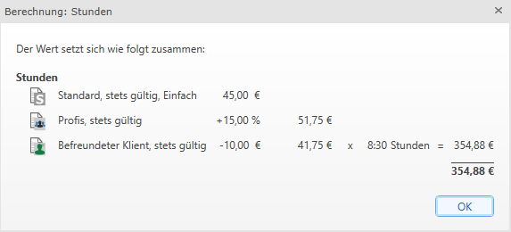 Wenn Sie wissen möchten, wie sich der Wert in der Spalte Berechneter Wert zusammensetzt, können Sie sich die Wertberechnung anzeigen lassen. Dies ist jedoch nur möglich, solange die Leistungen noch nicht verrechnet wurden.