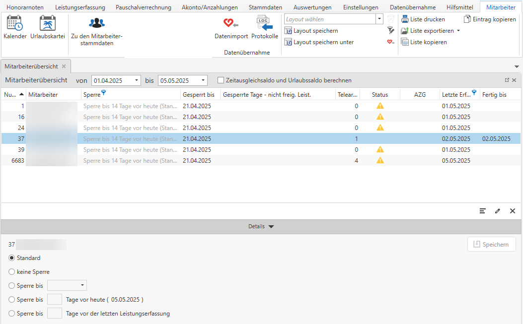 Sie können über den Eintrag Details für einzelne Mitarbeiter die Sperre abweichend eintragen/ändern.