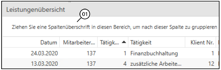 In der Leistungsübersicht werden Ihnen alle Leistungen für den gewählten Mitarbeiter und den gewählten Zeitraum angeführt. Sie können Spaltenüberschriften in den Bereich (1) ziehen, um nach dieser Spalte zu gruppieren. Somit wird Ihnen ermöglicht, die Leistungsübersicht nach bestimmten Kriterien zu gruppieren.