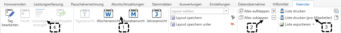 Es können unterschiedliche Ansichten (1) des Arbeitszeitkalenders geöffnet werden: