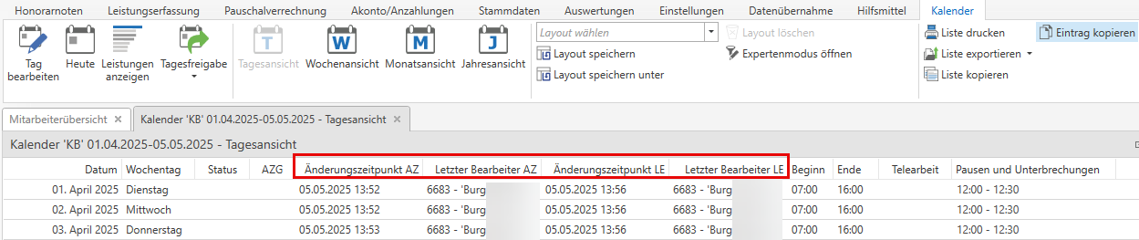 Im Arbeitszeitkalender kann man sich hierfür zusätzlich die Spalten Änderungszeitpunkt AZ, Letzter Bearbeiter AZ sowie Änderungszeitpunkt LE und Letzter Bearbeiter LE einblenden lassen. Auch der Mitarbeiter hat in seiner Leistungserfassung die Möglichkeit, sich diese Spalten einzublenden.