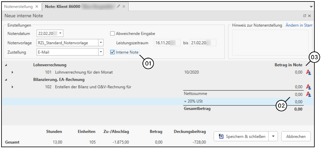 Die Option interne Note (1) in den Noteneinstellungen ist nur aktiv, wenn die Nettosumme aller USt-pflichtigen und nicht USt-pflichtigen Tätigkeiten Null (2) ergibt.