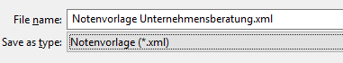 Bei Notenvorlagen handelt es sich um XML-Dateien. Der Dateityp und der Dateiname (= Name der Notenvorlage) werden automatisch beim Exportieren festgelegt. Sie können jedoch den Dateinamen auch überschreiben.