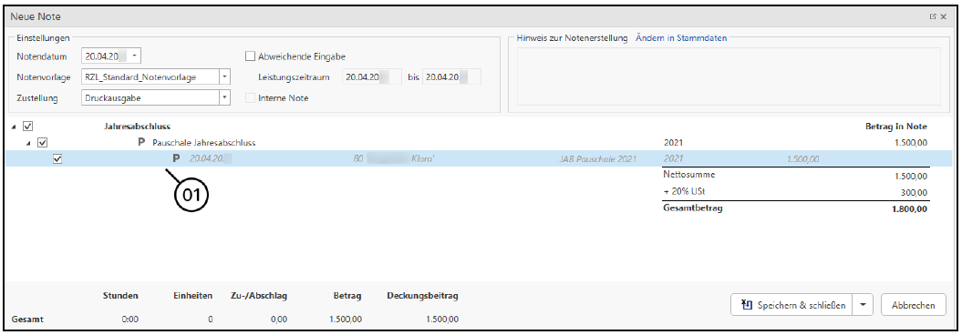 Innerhalb der Notenerstellung werden Pauschalzeilen mit einem fettgedruckten P (1) abgebildet. Der Text sowie der Projektzeitraum und der Betrag der Pauschalzeile können innerhalb der Notenerstellung abgeändert werden.