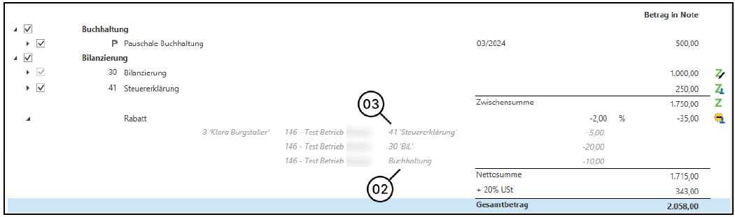 Werden im Zuge der Notenerstellung Pauschalen und Leistungen verrechnet, wird der Rabatt der Pauschale auf die Verrechnungsgruppe (2) verteilt und der der Leistung auf die jeweiligen Tätigkeiten (3).