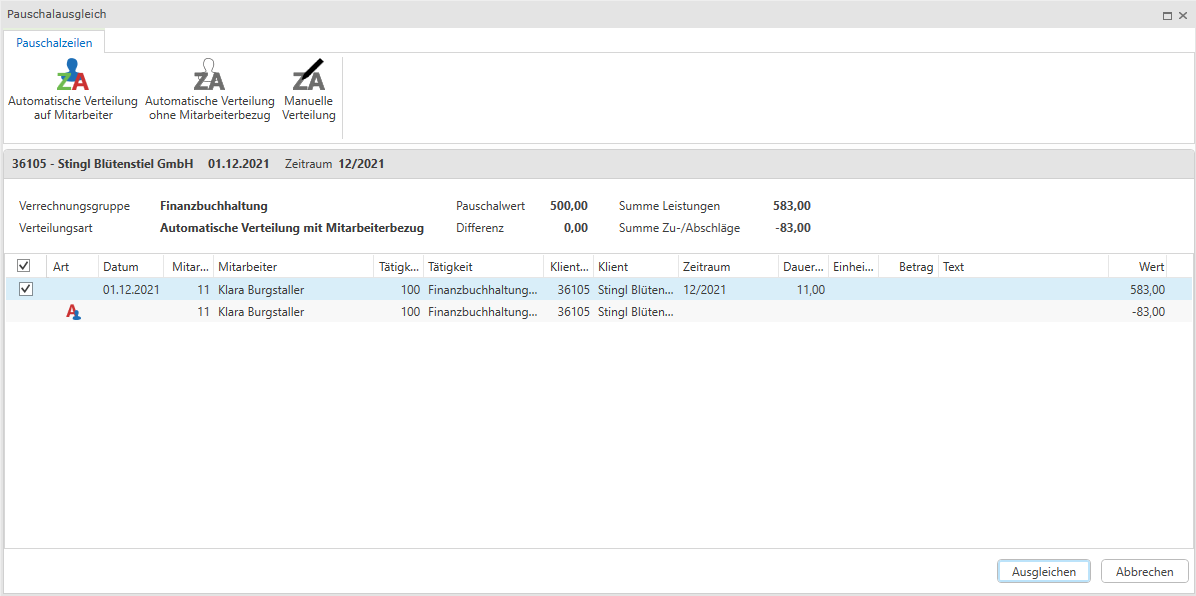 Es wurde monatlich eine Pauschale über 500 € für die Buchhaltung abgerechnet, sowie der Pauschalausgleich durchgeführt. Über die Monate hinweg kam es im Zuge des Pauschalausgleiches zu Zu-/Abschlägen.