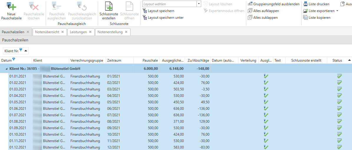 Durch Gruppieren und/oder Filtern der Ansicht der Pauschalzeilen können Sie schnell und einfach alle Zeilen des betroffenen Klienten selektieren (vgl. Umsatzstatistik Allgemein).