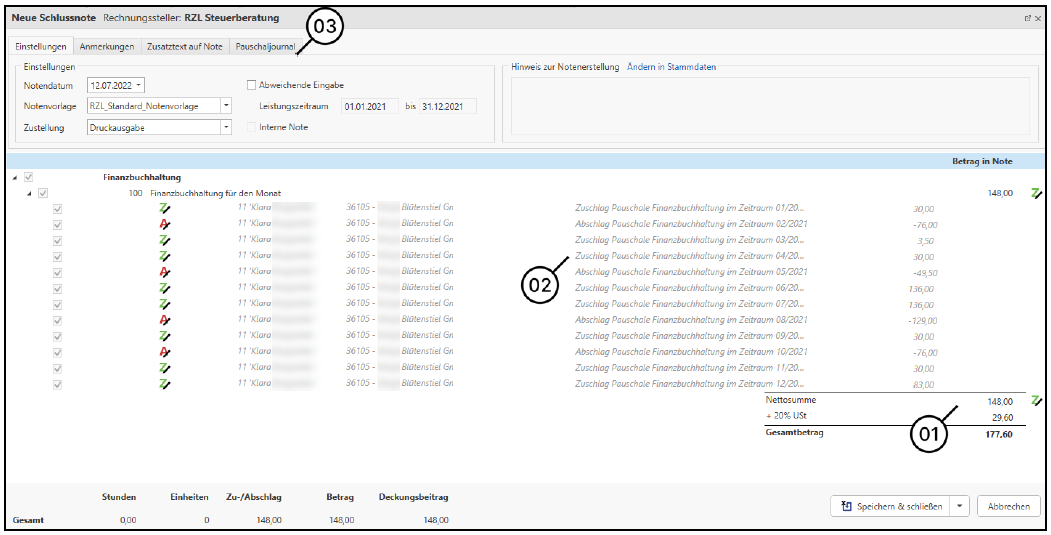 Über Pauschalverrechnung / Pauschalzeilen markiert man nun alle Pauschalzeilen eines Klienten, über die eine Schlussnote gestellt werden soll.