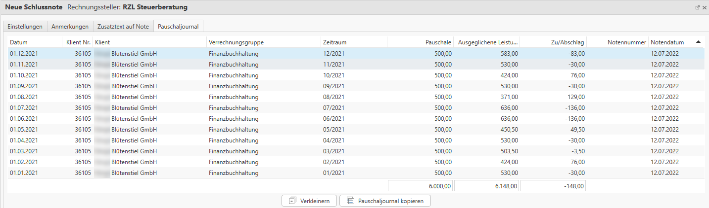 Eine Schlussnote kann nur über verrechnete Pauschalzeilen mit erfolgtem Pauschalausgleich und für den gleichen Klienten durchgeführt werden.