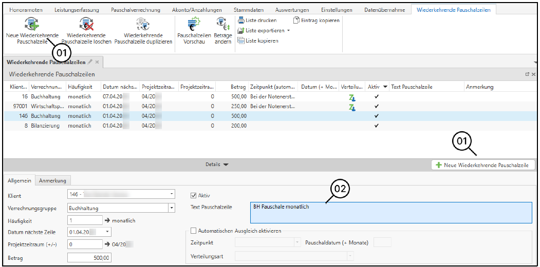 Eine neue wiederkehrende Pauschalzeile kann entweder über den Butten im Ribbon (1) oder über die Schaltfläche neue Wiederkehrende Pauschalzeile (1) angelegt werden.