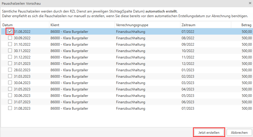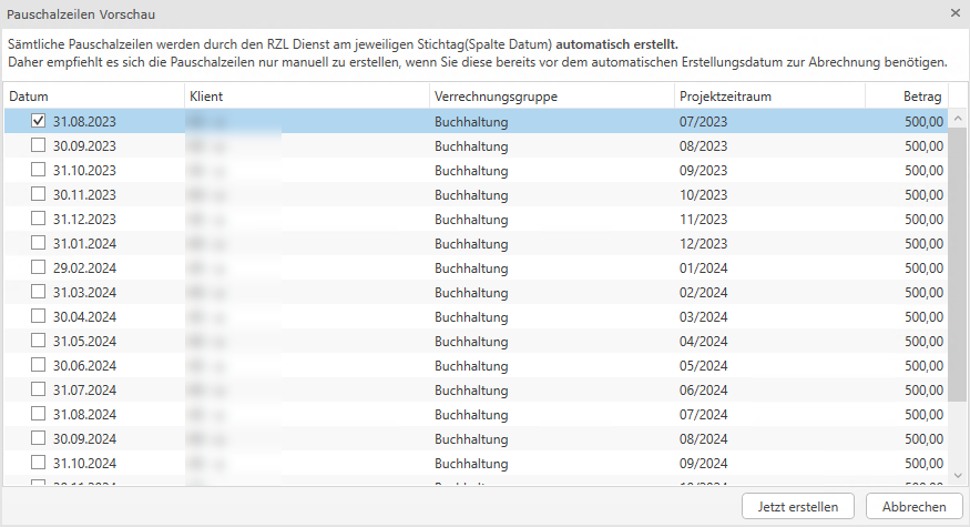 Die Pauschalzeilen müssen nur über die Pauschalzeilen Vorschau erzeugt werden, wenn Sie in der Vergangenheit liegen und gleich abgerechnet werden sollen, ansonsten werden die Zeilen monatlich/quartalsweise etc. über den RZL Dienst erzeugt.