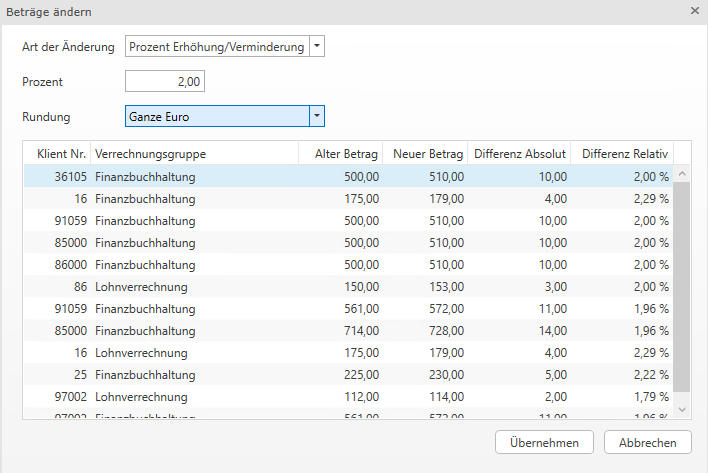 Bei prozentueller Erhöhung/Verminderung kann abhängig von der gewählten Rundungsoption die relative Erhöhung höher/niedriger ausfallen als von Ihnen hinterlegt.