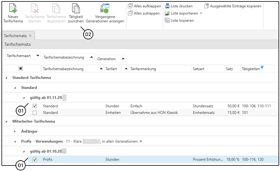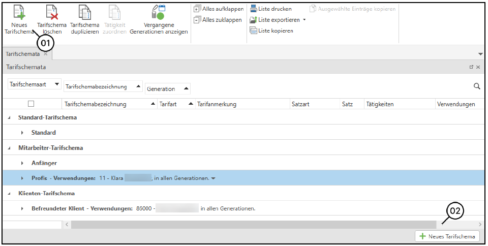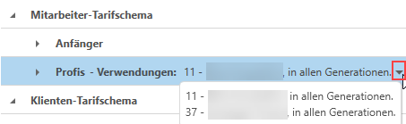 Über den kleinen Pfeil (1) neben den Verwendungen können Sie sich alle dem Tarifschema zugeordneten Mitarbeiter/Klienten anzeigen lassen.