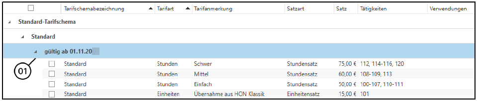 Weiters haben Sie die Option, sich hier alle Details zum jeweiligen Tarifschema einblenden zu lassen. Mithilfe des kleinen Pfeilsymbols (1) werden die jeweiligen Stunden-/Einheitensätze inklusive der zugeordneten Tätigkeiten je Generation angezeigt.