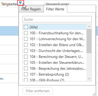 Innerhalb der Auflistung der einzelnen Tarifschemata können die einzelnen Spalten auch wieder gefiltert werden. Wenn Sie auf eine Überschriftenspalte klicken, wird ein blaues Filtersymbol angezeigt – nun können Sie beispielsweise nach der Tätigkeit filtern.