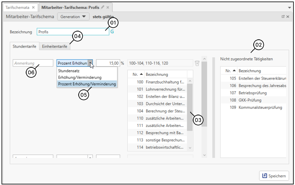 Bei Mitarbeiter- und Klienten-Schemata müssen nur jene Tätigkeiten zugeordnet werden, die abweichend vom Standard-Tarifschema verrechnet werden.