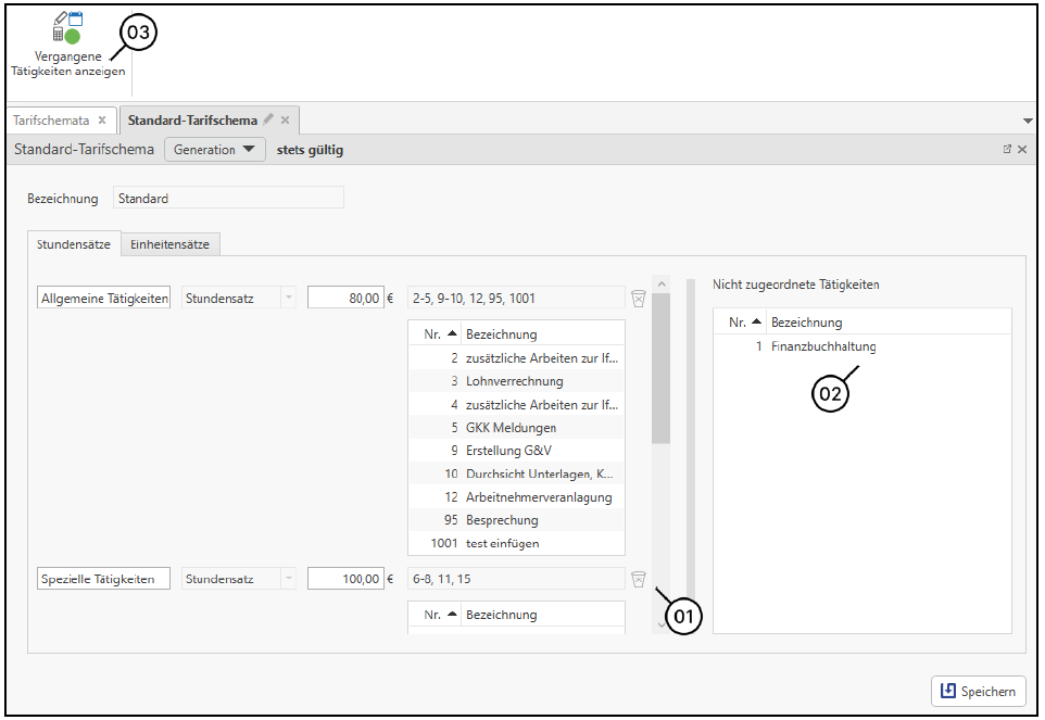 Soll ein bestimmter Stundensatz gelöscht werden, so können Sie dies mit dem Papierkorb-Symbol (1) veranlassen. Nicht zugeordnete Tätigkeiten können einfach mittels Drag & Drop zum gewünschten Satz gezogen werden (2). Vergangene Tätigkeiten (3) können ebenso, falls notwendig, eingeblendet werden.